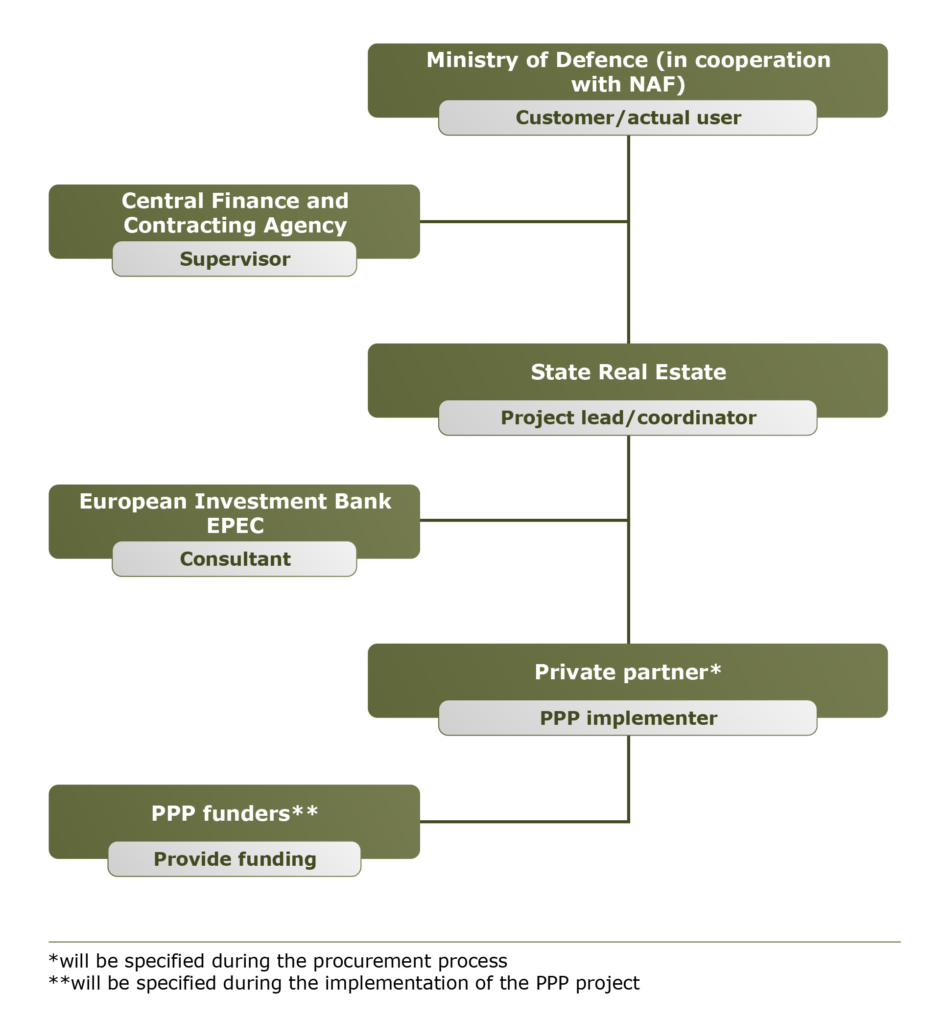 Public partner – the project is implemented by the state joint stock company “State Real Estate" on behalf of the Ministry of Defence. Private partner – a private entrepreneur selected as a result of public procurement*. |